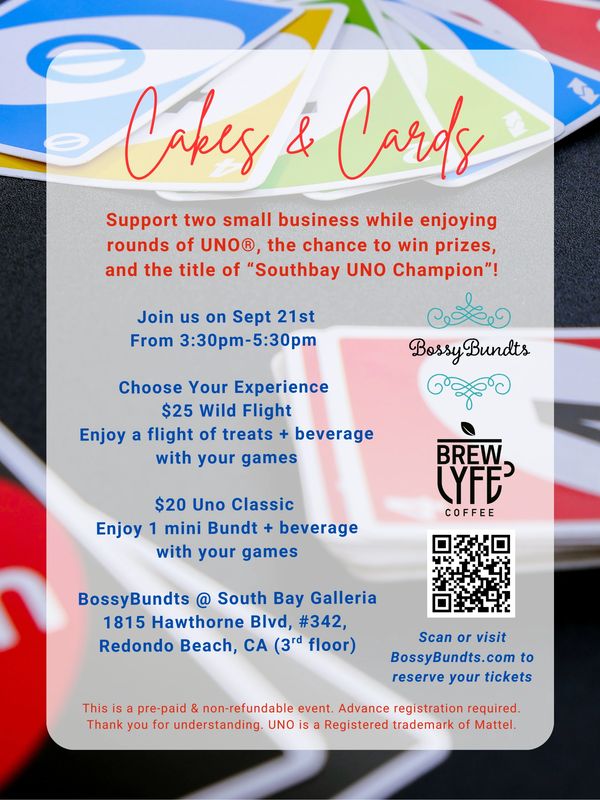 Join us and one of our favorite coffee shops -- Brew Lyfe -- for an afternoon Uno experience. Support two small businesses while enjoying rounds of Uno, the chance to win prizes, and the title of Southbay Uno Champion! Click reserve to choose your experience! We can't wait to welcome you.